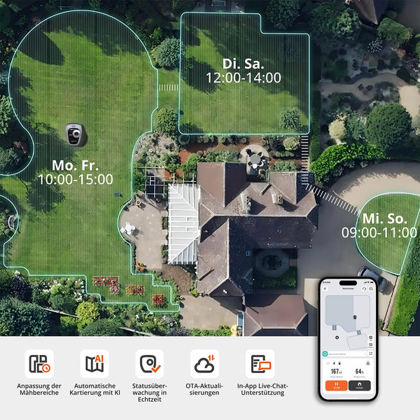 - Mühelose Rasenpflege auf lhren Fingerspitzen mit der Navimow App & Multizonen-Management: Mit der Navimow-App können Sie die Mähkarte bearbeiten, verschiedene Zeitpläne festlegen, Ihren Rasenmäherroboter fernsteuern, den Mähfortschritt verfolgen und Ihren Mähroboter bei Bedarf (mit dem optionalen Zubehör Access+) lokalisieren, falls er gestohlen wurde. Sie können auch ganz einfach OTA-Updates herunterladen, um auf die neuesten Funktionen und Verbesserungen zuzugreifen.
